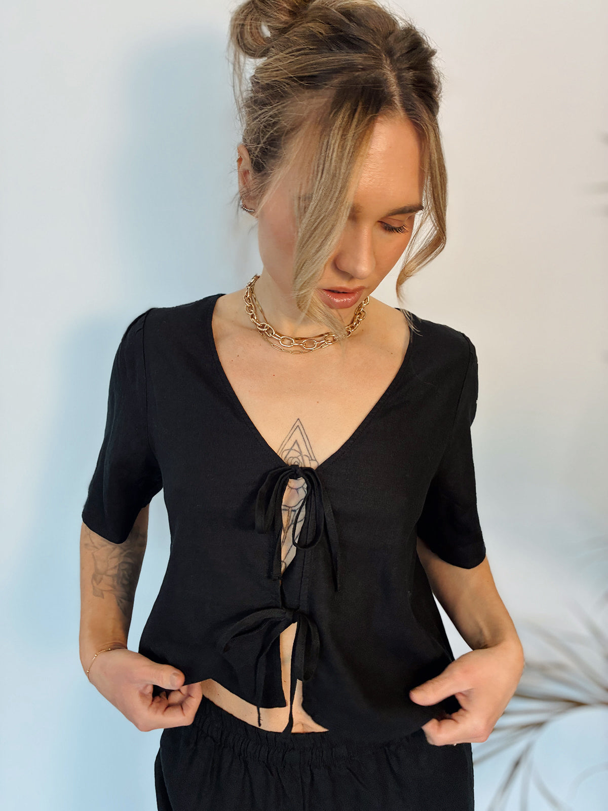 This feminine top is an instant favorite with its washed linen blend fabric, flattering relaxed fit, and tie front, finished with a modesty placket for easy coverage. Made to be dressed up or down, try it with denim or the Scout Linen Pants for a perfect Summer set!